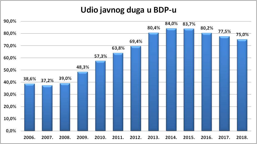 Ovi pokazatelji koje sam predstavio do sada ustvari kroje sliku onog najbitnijeg u cijeloj priči, udjelu javnog duga u BDP-u. U udjelu javnog duga u BDP-u vidjet ćemo otiske svakog od prethodnih pokazatelja, te ćemo moći utvrditi ima li doista nepravde u našoj ocjeni boniteta.