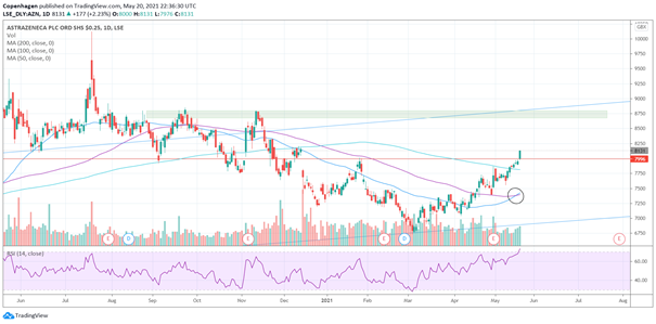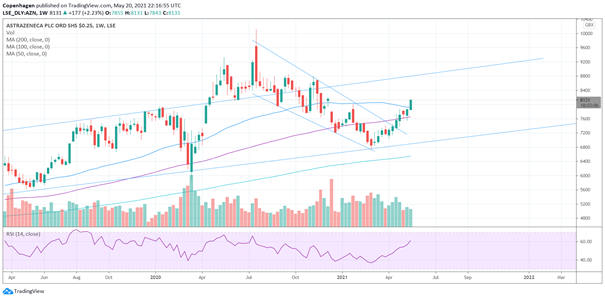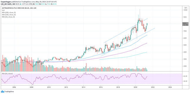 Graf AstraZenece promatrati ćemo kroz više vremenskih okvira: mjesečni graf, tjedni i dnevni graf kako bi dobili što detaljniji uvid u kretanje cijene te iz više perspektiva. Najopsežniji grafikon na kojem svaka svjećica predstavlja jedan mjesec služi nam za utvrđivanje generalnog trenda. Vidljiv je rastući trend u skladu s kretanjem indeksa I oporavkom gospodarstva kroz taj period. Cijena se kreće kroz rastući kanal u proteklih pet godina. Sredinom prošle godine cijena je probila kanal prema gore, no ubrzo se vratila na razine kanala.