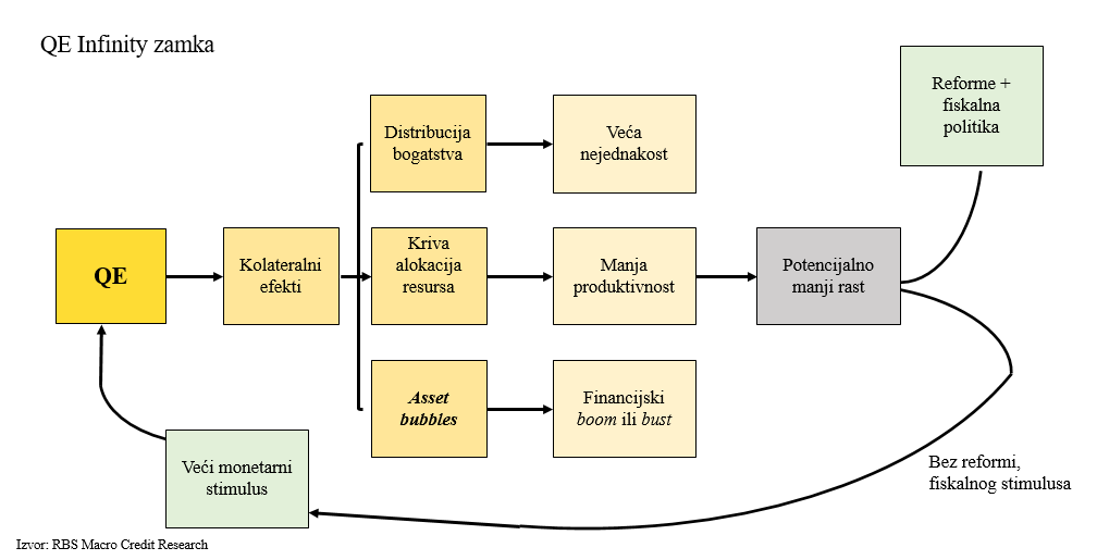 Nekoliko je problema u takvoj monetarnoj politici. Prvi problem je taj što držeći kamatne stope nisko (jedan od uzroka QE-a), ECB (ili bilo koja središnja banka) efektivno smanjuje profitabilnost poslovnim bankama, koje u potrazi za većim prinosima, mogu plasirati sredstva u rizičnije zajmove. Prinosi su također manji i u nebankovnom sektoru, u kojem dominiraju u zadnje vrijeme vrlo atraktivni mirovinski i investicijski fondovi. Ti investicijski ulagači su danas najveći nositelji štednje građana, te u potrazi za većim prinosima mogu uzrokovati značajne odljeve kapitala iz Eurozone na tržišta s višim prinosima. Drugi veliki problem nalazi se u situaciji zamke likvidnosti, odnosno stanja vrlo niskih kamatnih stopa, gdje učinkovitost utjecaja monetarne politike na smanjenje šokova i utjecaj na ekonomski rast postaje zanemariva.
