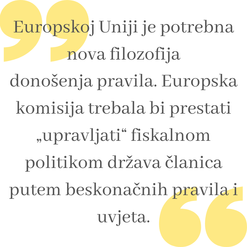 Europskoj Uniji je potrebna nova filozofija donošenja pravila. Europska komisija trebala bi prestati „upravljati“ fiskalnom politikom država članica putem beskonačnih pravila i uvjeta. Komisija bi trebala intervenirati samo kad vlada krene na putu prikupljanja uistinu neodrživog duga. U ovom scenariju, izazov za državu članicu više ne bi bio da udovolji Komisiji, već da uvjeri investitore da ona posluje odgovorno u odnosu na dug. Inače, glavni posao Komisije trebao bi biti pružanje informacija tržištima o zdravlju gospodarstva države članice.