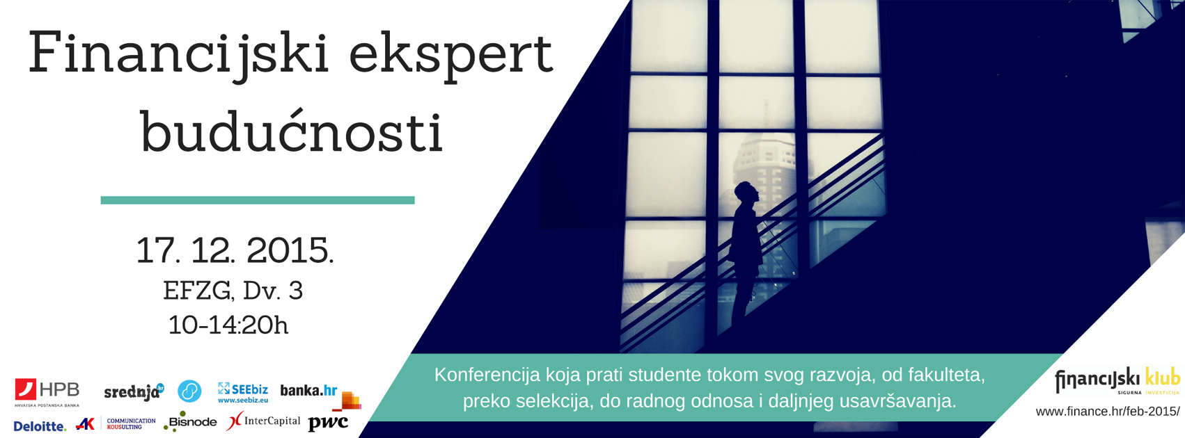 Konferencija Financijski ekspert budućnosti u organizaciji studentske udruge Financijski klub održat će se 17. prosinca od 10:00 do 14:20 h na Ekonomskom fakultetu u Zagrebu u dvorani 3. Cilj konferencije je upoznati studente s potražnom stranom tržišta rada s naglaskom na financijski sektor. Financijski ekspert budućnosti će studente upoznati s načinima putem kojih se mogu istaknuti iz mnoštva te krenuti na svoj put k vrhunskoj karijeri na području financija.