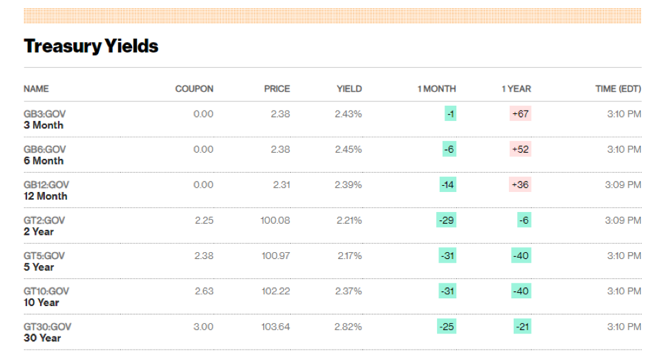 Gledamo li stupac „Yield“ (eng. prinos), vidimo kako trezorski zapisi (3, 6 mjeseci) ostvaruju veći prinos od referentne bezrizične stope, odnosno 10g trezorske obveznice. Ovaj nam je podatak indikativan da tržišta kratkoročne rizike smatraju ozbiljnijima od dugoročnih, te se temeljem toga može zaključiti kako je SAD suočen s recesijom, ili barem usporavanjem gospodarskog rasta.