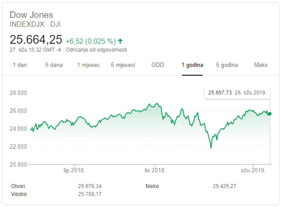 Google Finance, Dow Jones Industrial Average, Dostupno na: https://www.google.com/search?q=dow+jones&rlz=1C1VSNC_enHR601HR601&oq=dow+j&aqs=chrome.1.69i57j0l5.2559j1j7&sourceid=chrome&ie=UTF-8[27.3.2019.]