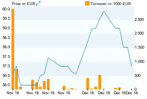 Prikaz kretanje cijene i ostvarenog prometa dionice NLB-a (14.11.’18. – 14.12.’18.)