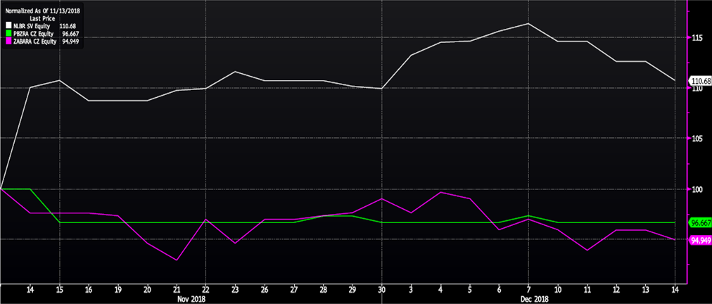 Usporedba normaliziranog kretanja cijene NLB-a, PBZ-a i ZABA-e, pri čemu je uzeta početna vrijednost od 100 (14.11.’18. – 14.12.’18.)