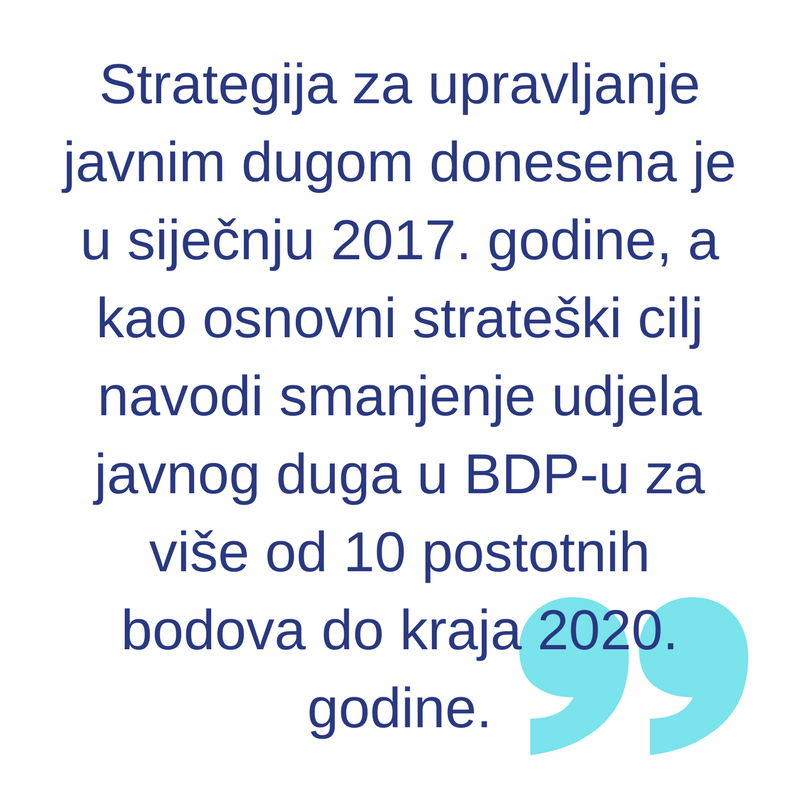 Strategija za upravljanje javnim dugom donesena je u siječnju 2017. godine, a kao osnovni strateški cilj navodi smanjenje udjela javnog duga u BDP-u za više od 10 postotnih bodova do kraja 2020. godine. U ovom osvrtu usredotočit ću se prije svega na projekcije kretanja i osnovne ciljeve te smjernice upravljanja javn