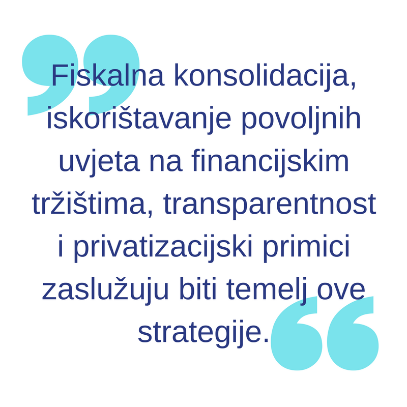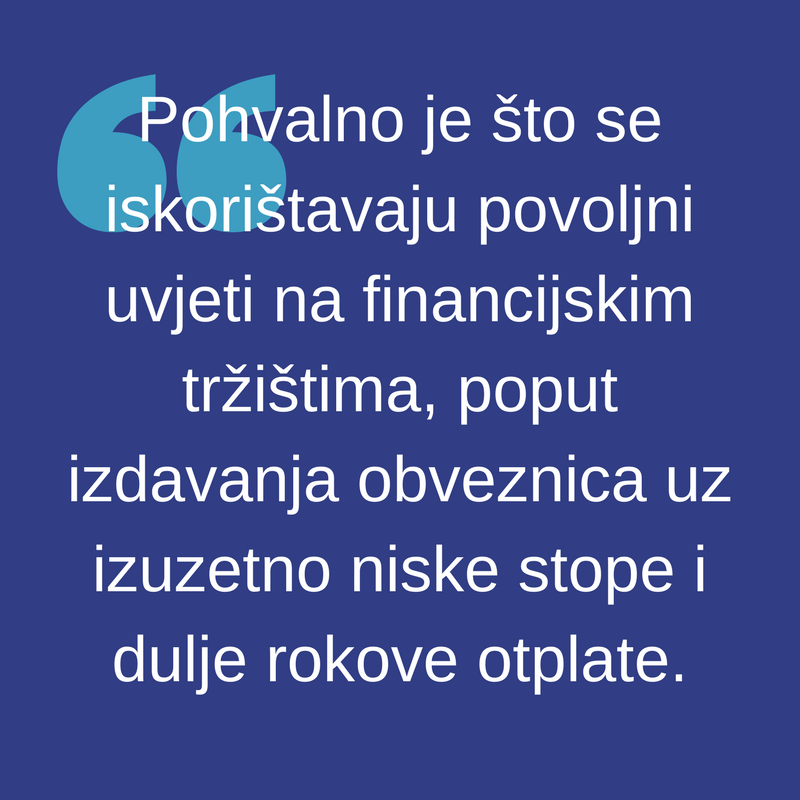 Možemo primijetiti da država kreće nešto intenzivnije koristiti obveznice i udaljavati se od financiranja kreditima od poslovnih banaka što zasigurno predstavlja napredak. Pohvalno je što se iskorištavaju povoljni uvjeti na financijskim tržištima, poput izdavanja obveznica uz izuzetno niske stope i dulje rokove otplate, ali strategija se nikako ne smije temeljiti samo na tome. Uvjeti na financijskim tržištima su cikličke prirode i razdoblje niskih stopa sigurno neće trajati zauvijek, a javni dug neće i ne može biti održiv bez strukturalnih promjena na rashodovnoj strani državnog proračuna.