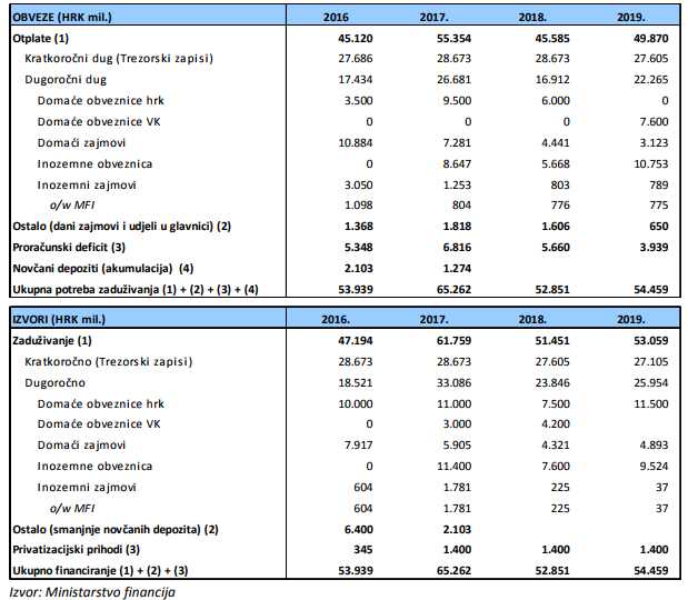 Za početak, možemo uočiti da se Ministarstvo u ovoj strategiji usredotočilo na iskorištavanje trenutnih povoljnih uvjeta na financijskim tržištima, na aktiviranje državne imovine odnosno privatizacijskih primitaka te na povećanje transparentnosti zaduživanja. Sama transparentnost zaduživanja izuzetno je važna, povećava povjerenje građana u državu, ali prije svega povećava kredibilitet države na financijskim tržištima, odnosno utječe na poboljšanje kreditnog rejtinga. Na sljedećoj tablici možemo vidjeti obveze i izvore financiranja državnog proračuna do 2019. godine.