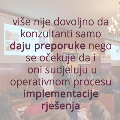 Nakon prvog panela, uslijedilo je predavanje Tomislava Čorka, Principala svjetske konzultantske kuće The Boston Consulting Group (BCG) na temu Budućnost consultinga. Tomislav Čorak je istaknuo kako je trenutno glavna karakteristika uspješnih konzultantskih projekata mogućnost implementacije danih preporuka odnosno više nije dovoljno da konzultanti samo daju preporuke nego se očekuje da i oni sudjeluju u operativnom procesu implementacije rješenja. Kada razmišljamo o budućnosti, često se postavlja i pitanje robotike pa se i naš predavač dotaknuo te teme te rekao da će roboti moći zamijeniti i do 80% ljudi u administrativnim poslovima odnosno da roboti mogu zamijeniti sve jednostavne procesne repetitivne poslove. Čorak je predavanje zaključio činjenicom da iako umjetna inteligencija ima bolje analitičke sposobnosti od čovjeka, ne posjeduje emocionalnu inteligenciju koja je u konzultantskom poslu itekako bitna.
