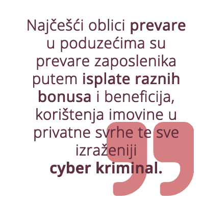 Nadovezali su se i na zastupljenost forenzične revizije u Republici Hrvatskoj u odnosu na Europsku Uniju složivši se da se u našoj državi mali kadar bavi tim zanimanjem te da postoji velik potencijal za stručno obrazovanje osoba i približiti im ovo zanimljivo i dinamično okruženje. Najčešći oblici prevare u poduzećima su prevare zaposlenika putem isplate raznih bonusa i beneficija, korištenja imovine u privatne svrhe te sve izraženiji cyber kriminal. Jedna zanimljiva studija je pokazala da poduzeće gubi oko 5% prihoda putem raznih ilegalnih radnji te da se ukupna vrijednost izgubljenog novčanog iznosa kreće oko 3,7 trilijuna dolara