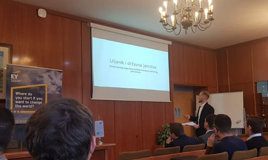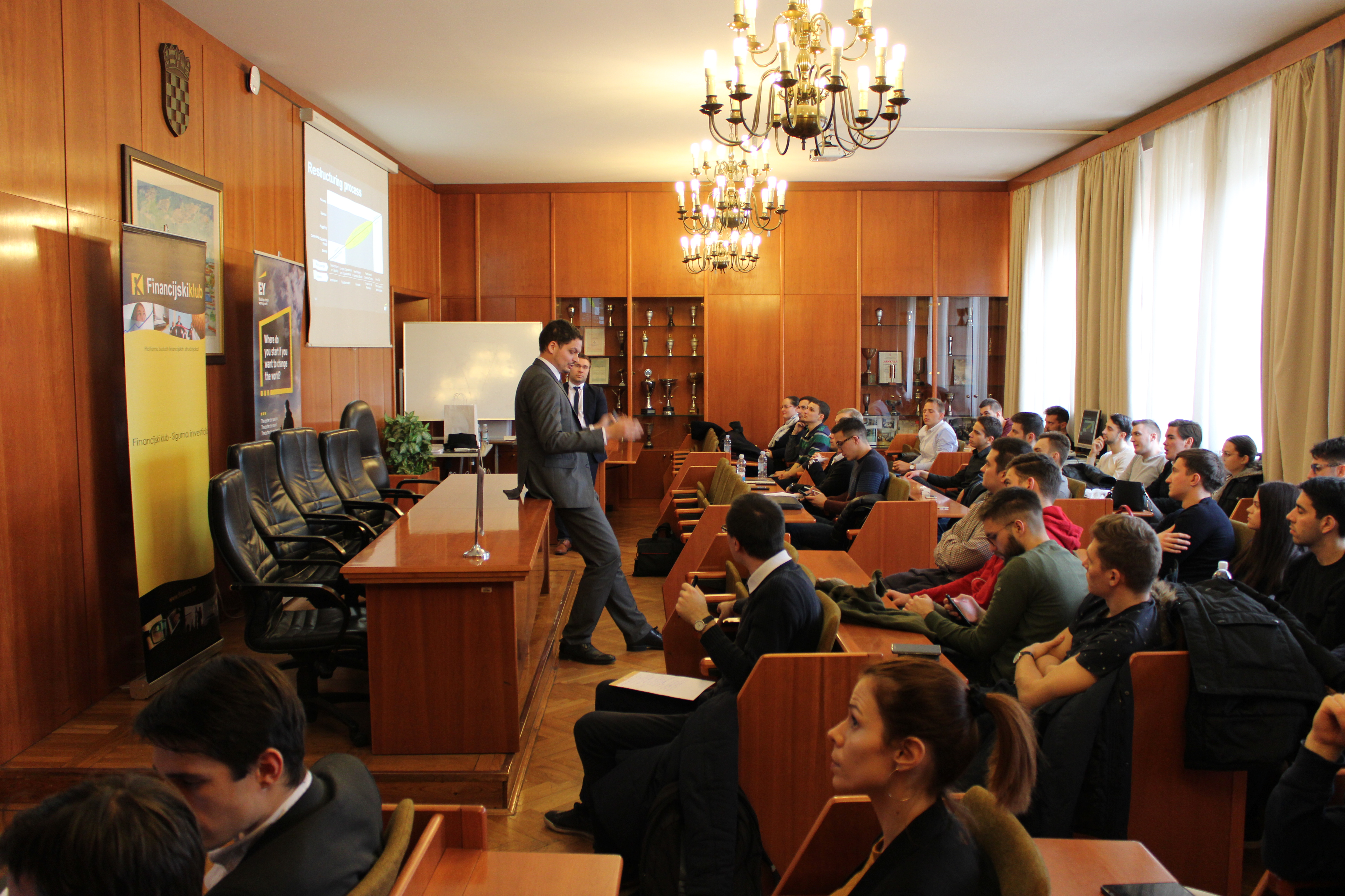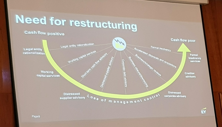 Nakon kolege Slovica, uslijedilo je izlaganje dvojice Vedrana iz EY-a o financijskom i operativnom restrukturiranju. Vedran Obadić i Vedran Ercegović su menadžer i senior u „Transaction Advisory Services“ (TAS), odjelu u EY-u koji se bavi transakcijskom potporom, infrastrukturnim savjetovanjem, i transformacijom kapitala. Saznali smo što je u stvari restrukturiranje; naši predavači definirali su ga kao „mijenjanje procesa koji su poduzeće doveli u probleme“. Nakon provedenog „due diligence-a“ (proces istrage poslovanja poduzeća) slijedi proces restrukturiranja koji se može podijeliti u četiri kategorije korporativnog restrukturiranja: