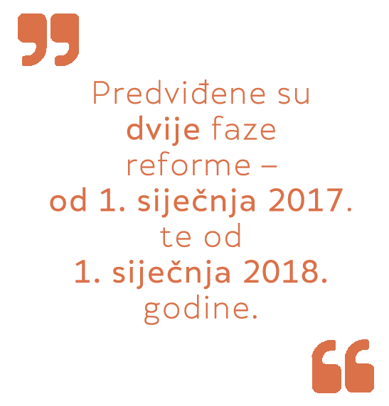 Predviđene su dvije faze reforme – od 1. siječnja 2017. te od 1. siječnja 2018. godine. U prvoj fazi planirano je snižavanje stope PDV-a na pojedine proizvode i usluge s 25% na 13% – inputi u poljoprivrednoj proizvodnji, isporuka električne energije, dječje sjedalice za automobile, odvoz smeća, isporuka ljesova i urni. Snižena stopa od 13% prelazi u stopu od 25% za usluge u ugostiteljstvu i šećer, dok za kino ulaznice stopa od 5% prelazi u stopu od 13%.