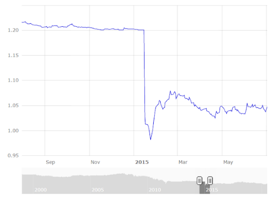 Vrijednost švicarskog franka konstantno je počela rasti nakon pojave hipotekarne krize u SAD-u. Razlog tome je pojava percepcije franka kao novog sigurnog utočišta prije širenja nove potencijalne financijske krize. Zbog nekontroliranog rasta franka, Švicarska središnja banka (SNB) odlučila je zamrznuti tečaj eura i franka kako bi se zaštitio švicarski izvoz. Zamrznuti tečaj znači održavanje tečaja na određenoj razini, ne dopuštajući nastup većih promjena. Međutim, SNB je 15. siječnja 2015. godine odlučila odmrznuti tečaj euro/franak koji je održavala na razini približnoj 1,20. Razlog odmrzavanju bila je bojazan od hiperinflacije franka te gubitaka koji je SNB bilježila kupnjom eura. Vrijednost švicarskog franka porasla je za otprilike 20 postotnih bodova nakon spomenutog odmrzavanja. Slučaj povećanja vrijednosti franka, odnosno pada eura naspram franka nakon odmrzavanja, evidentan je na Grafu 1.