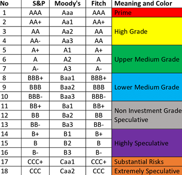 Kreditni rejting izdaje se u obliku slova A, B, C, odnosno AAA+ za najbolji kretni rejting, CCC za najgori kreditni rejting.