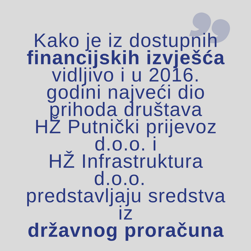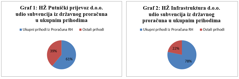 Kako je iz dostupnih financijskih izvješća vidljivo i u 2016. godini najveći dio prihoda društava HŽ Putnički prijevoz d.o.o. i HŽ Infrastruktura d.o.o. predstavljaju sredstva iz državnog proračuna. Nominalno izraženo, riječ je o iznosu od 523.329.000 kuna dodijeljenih društvu HŽ Putnički prijevoz d.o.o., odnosno 938.463.000 kuna dodijeljenih društvu HŽ Infrastruktura d.o.o. Relativno izraženo, riječ je 61% (Graf 1), odnosno 78% (Graf 2) ukupnih prihoda navedenih društava. Društvo HŽ Putnički prijevoz d.o.o. 2016. godinu završilo je s dobiti od 184.000 kuna, a društvo HŽ Infrastruktura s dobiti od 1.012.000 kuna. Društvo HŽ Cargo d.o.o. nema pravo na dodjelu sredstava iz Proračuna RH te je 2016. godinu završilo s gubitkom od 121.111.868 kuna. Osim navedenog gubitka, podatak koji još više zabrinjava akumulirani je gubitak koji je prošle godine iznosio 768.941.178 kuna.