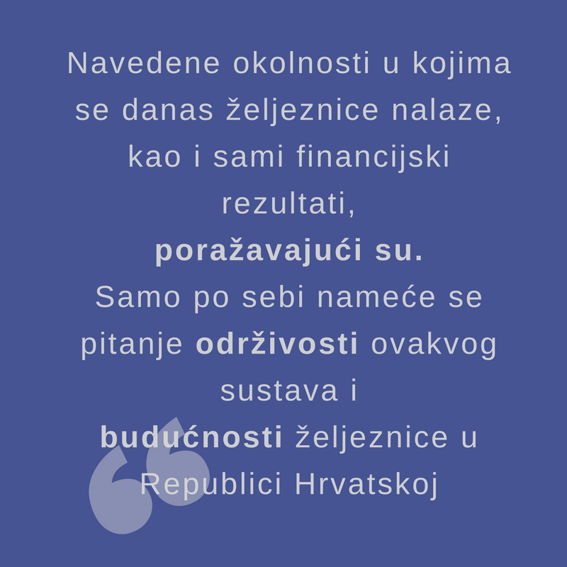 Navedene okolnosti u kojima se danas željeznice nalaze, kao i sami financijski rezultati, poražavajući su. Samo po sebi nameće se pitanje održivosti ovakvog sustava i budućnosti željeznice u Republici Hrvatskoj. Čak je i laiku poput mene, jasno kako je ovakav sustav ogroman teret za porezne obveznike koji na kraju i nemaju neku preveliku korist od njega obzirom na stanje u kojem se on trenutno nalazi. Mišljenja sam kako je potrebno provesti odlučnije korake sa ciljem revitalizacije željeznica u Republici Hrvatskoj. Nužno je optimizirati kompanijsko poslovanje te ga učiniti manjim, učinkovitijim, bržim i profitabilnijim.
