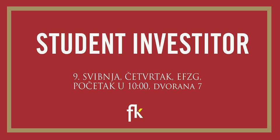 Konferencija Student Investitor održana je 9. svibnja u prostorijama Ekonomskog fakulteta u Zagrebu. Privukla je veliki broj studenta zainteresiranih za tržišta kapitala, ulaganje, trejding, upravljanje imovinom i slične teme, te se u dvorani tražilo i mjesto više. Na konferenciji su prisustvovali gosti predavači iz ZB Investa, InterCapitala te OptimTrader trgovačke platforme i HUTA-e. Teme o kojima su govorili su bile upravljanje dioničkim fondovima, upravljanje obvezničkim fodovima, procjena vrijednosti poduzeća u praksi te kako mali investitor može ulagati na financijskom tržištu. Uz njih su članovi Financijskog kluba predstavljali svoju analizu Netflixove dionice, što je uključivalo markoanalizu američkog tržišta, analizu Netflixove industrije i konkurencije, procjena fer vrijednosti njegove dionice na tržištu te na kraju i tehničku analizu kretanja njezine cijene. Sponzori konferencije su bili Milka Joy Fills i Halls.