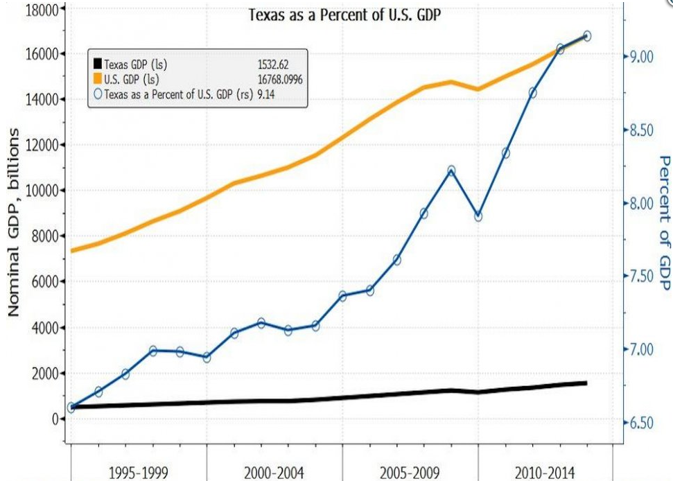 Popularna je i mantra o teksaškoj ovisnosti o cijeni nafte. Neosporno je da se Teksas ne samo okoristio naftnim boomom u Sjedinjenim Američkim Državama, već je i njegov pokretač, stvorivši niz dobro plaćenih radnih mjesta u industriji. Međutim, i nakon što su se cijene nafte prepolovile, gospodarstvo Teksasa se teško može nazvati posustalim. Ono je iznimno diversificirano, o čemu svjedoči i činjenica da je 2012. Teksas prestigao čak i prilično mnogoljudniju Kaliforniju po vrijednosti izvoza visokotehnoloških proizvoda. Houston i Austin su novi San Francisco. Kao što novi podaci BEA pokazuju, teksaška metropolitanska područja Houston-The Woodlands-Sugar Landa i Dallas-Fort Worth-Arlingtona uvjerljivo su najbrže rastuća u zadnjih 5 godina među 10 najvećih: