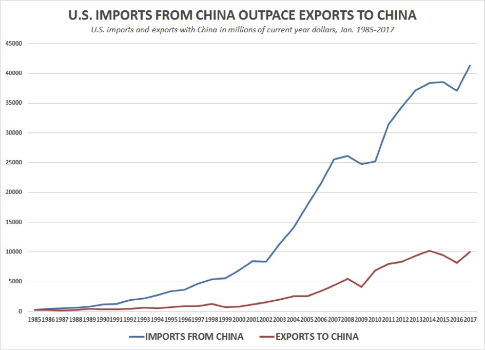 U 2017. godini SAD je uvezao robu iz Kine u vrijednosti od 504 milijarde dolara, dok je Kina uvezla 130 milijardi dolara. Američki predsjednik Trump tvrdi da rastući deficit pokazuje kako Kina nepravedno ograničava američki izvoz, a jača domaće proizvođače. Trgovinski deficit nije nužno loš sam po sebi, a pogotovo deficit vanjskotrgovinske bilance SAD-a, no postoji snažna rasprava o tome hoće li Kina “iskorištavati” SAD u svojim trgovinskim zakonima i subvencijama za domaće tvrtke. Razmjena dobara između ova dva gospodarstva, čiju strukturu pokazuju slike u nastavku, je velika te bi se bilo kakve protekcionističke mjere negativno odrazile na profitabilnost s obje strane.