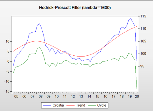 Napomena: Crvena linija prikazuje trend kretanja hrvatskog gospodarstva koji je dobiven HP filterom. Zelena linija prikazuje odstupanje BDP-a od dugoročnog trenda. Plava linija prikazuje stvarne vrijednosti BDP-a za RH