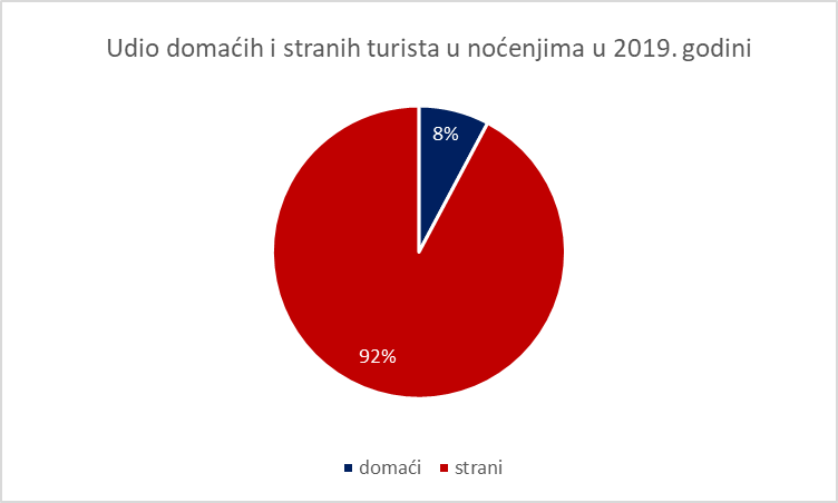 Turizam, riječ koja ima mitsko značenje u pričama o našem gospodarstvu, zbog veličine svoga udjela u BDP-u (negdje između 15%-20%) ima posebno mjesto u analizi hrvatske ekonomije. Uglavnom, kada pričamo o turizmu mislimo na strane goste (Nijemce, Čehe, Poljake, Slovence etc.) budući da je broj domaćih gostiju premali da može generirati potražnju na razini 15% do 20% BDP-a. Graf 2. prikazuje udio domaćih i stranih turista u ukupnom broju noćenja za 2019. godinu. Iz grafa je vidljivo da strani turisti čine 92% noćenja što govori o njihovoj važnosti u generiranju turističke potražnje.