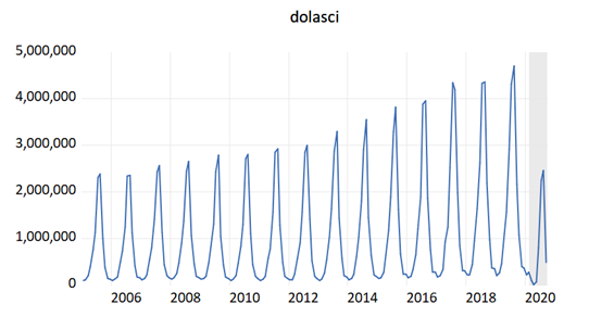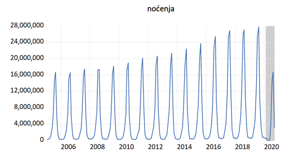Na grafu 4. prikazani su dolasci turista od 2005. do rujna 2020. godine u Republiku Hrvatsku. Primjetno je sezonsko ponašanje podataka što nije uopće začuđujuće budući da je opće poznata činjenica da turizam postoji samo ljeti kod nas. Nadalje primjećujemo kako je do 2005. godine prisutan snažan trend rasta broja dolazaka. Međutim, ove godine je zbog pandemije zabilježen snažan pad broja dolazaka. Na vrhuncu sezone je bilo otprilike upola manje turista nego lani. Takav podatak nam govori o ozbiljnosti šoka tj. o vrlo restriktivnom odnosu država i pojedinaca prema putovanjima u druge zemlje. Takvo restriktivno ponašanje u kombinaciji s padom dohotka u državama od kuda nam dolazi najveći broj turista dovelo je do pada broja dolazaka. Slična situacija, ako ne i identična dogodila se i s brojem noćenja. Broj noćenja od 2005. do rujna 2020. godine je prikazan na Grafu 5.