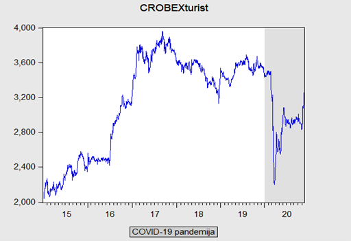 Kako bi analizirali prihode turističke industrije može se provesti analiza CROBEXturist indeksa Zagrebačke burze (ZSE). U njemu su sadržane velike hrvatske kompanije koje se bave turizmom te čije dionice kotiraju na ZSE. Budući da je došlo, s nastankom COVID-19 pandemije, do ozbiljnog pada turističke potražnje ekonomska intuicija nam govori da bi trebalo doći do pada vrijednosti CROBEXturist indeksa. Na grafu 6. prikazane su vrijednosti CROBEXturist indeksa za razdoblje do 2015. do 19.11.2020. godine.
