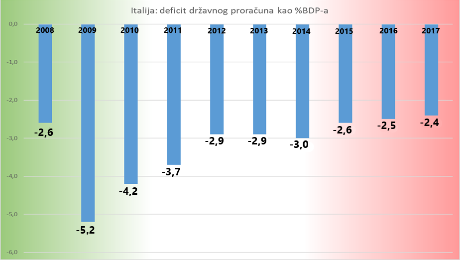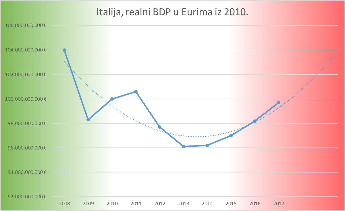 Italija je prema rastu BDP-a u situaciji u kojoj će tek oko 2020 dostići razinu BDP-a iz 2008. godine. S obzirom na apsolutni porast broja stanovnika u Italiji, nedvojbeno je da Italija razinu BDP-a Per Capita iz 2008. godine neće dostići još barem četiri godine. Realni BDP u Italiji, od prestanka recesije 2013. godine raste prosječnim stopama od 0.82% godišnje. To je rast u okvirima statističke greške, stoga ustvari ne čudi da je Europska Komisija zabrinuta oko toga da se proračunska nedisciplina nastavi dalje. Ovim tempom rasta duga u odnosu na stopu rasta BDP-a Italija srlja prema potpunom ekonomskom kolapsu, a s obzirom na svoju veličinu i značaj u Europi i svijetu, to predstavlja rizik za cijelu Europu.