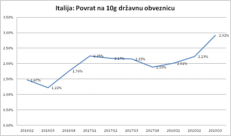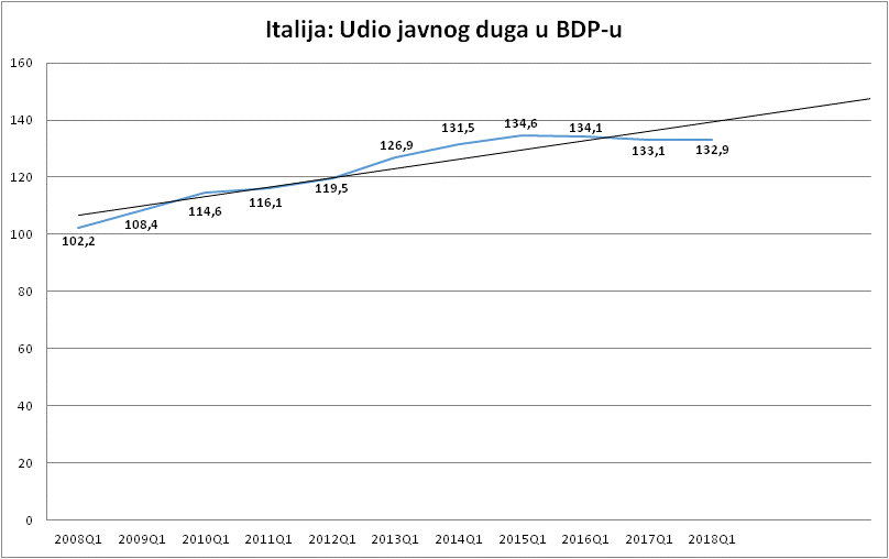 Italija je s novim proračunom koji projicira deficit od 2.4% BDP-a, najavila kontinuitet fiskalne politike koja je Italiji u periodu od 10 godina nabujala javni dug za 30 postotnih poena u odnosu na 2008. godinu. U grafikon sam dodao i linearni trend koji ukazuje na to da ako Italija nastavi voditi fiskalnu politiku na ovaj način, da će do sredine 2020 imati razinu javnog duga na gotovo 150% BDP-a!