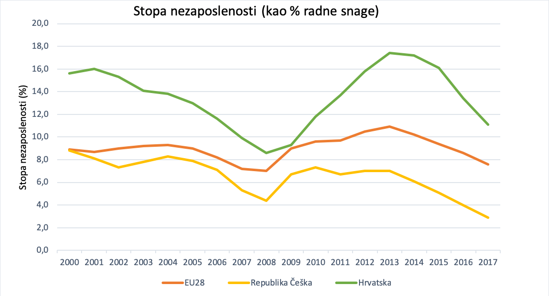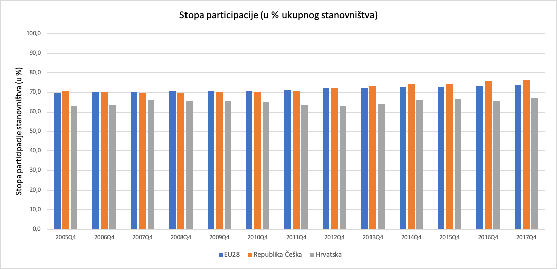 Od 2000. do 2017. godine Češka je u svakoj godini imala manje stope nezaposlenosti od prosjeka EU28 te je značajno odstupala od Hrvatske stope nezaposlenosti. Samo po pokazatelju stope nezaposlenosti može se zaključiti da je tržište rada u Češkoj vrlo jako. Stopa participacije u Češkoj je od 2005. do 2012. godine bila jednaka ili neznatno niža od EU28 te se od 2013. godine nastavlja trend blagog rasta. Na taj trend rasta je sigurno utjecala jaka zaposlenost te su mnogi radnici izvan radne snage ponovno ušli na tržište rada. U svim godinama prikazanim na grafu, Hrvatska stopa participacije manja je od Češke.