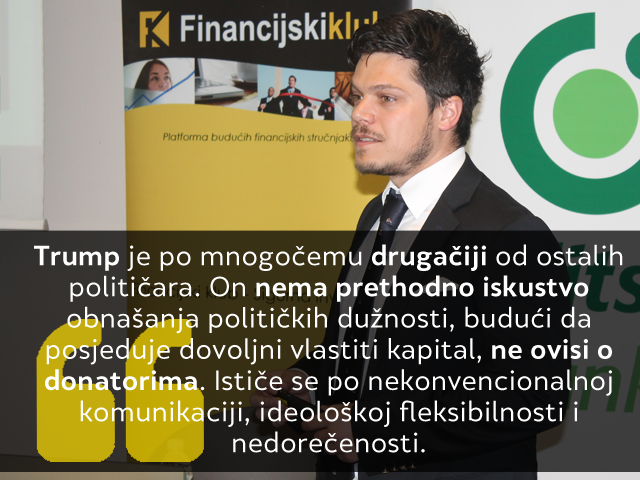 Višeslav Raos, docent Fakulteta političkih znanosti, je zanimljivim predavanjem o politici predsjednika SAD-a Donalda Trumpa ukazao na moguće posljedice u svjetskoj politici. Trump je po mnogočemu drugačiji od ostalih političara. On nema prethodno iskustvo obnašanja političkih dužnosti, budući da posjeduje dovoljni vlastiti kapital, ne ovisi o donatorima. Ističe se po nekonvencionalnoj komunikaciji, ideološkoj fleksibilnosti i nedorečenosti. On nije tipični republikanac i ne pripada nijednoj struji unutar republikanske stranke.