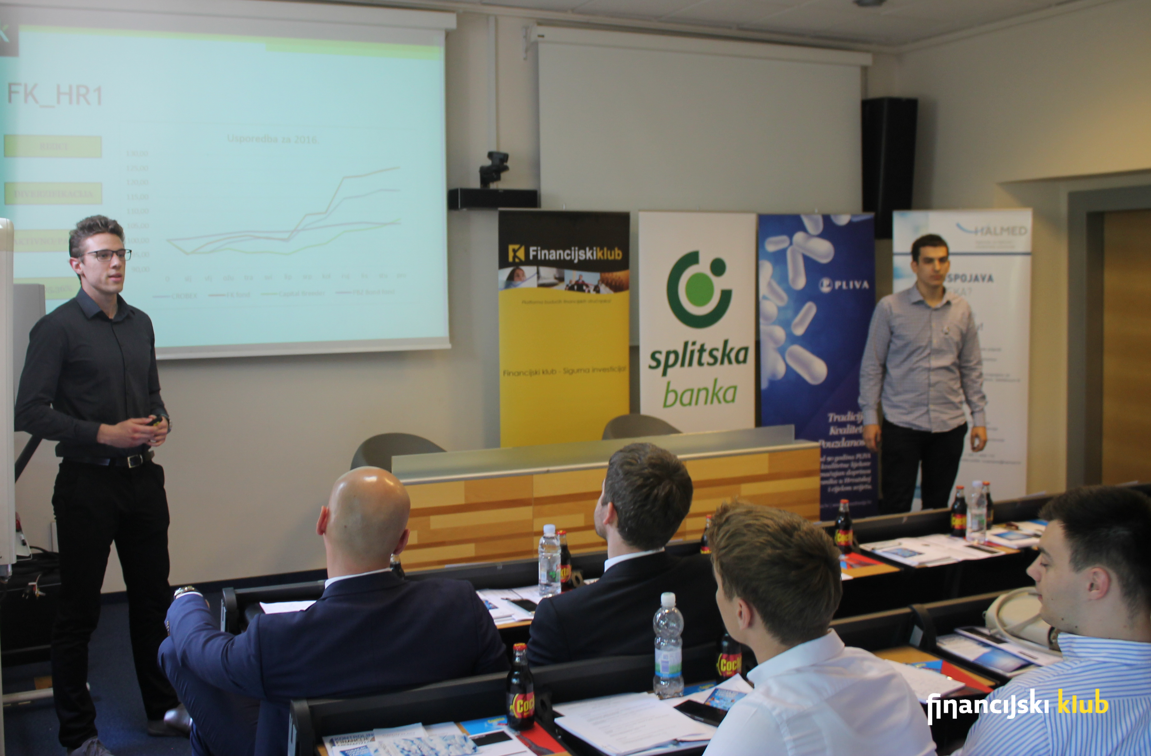 ukoliko bi se one prodale po trenutnoj tržišnoj cijeni, time bi se moglo pokriti dva državna deficita. Nadalje, objasnio je i strategije ulaganja mirovinskih fondova, odnosno na koji način strateški alociraju imovinu. Koriste se analizama, matematičkim modelima, fundamentalnom analizom i određuju koliko posto u što će uložiti za cijelu godinu. Vrlo su im bitni mediji, makroanalize te sektorske analize, politike centralnih banaka i kretanja tečajeva. Na kraju predavanja osvrnuo se i na trenutnu i aktualnu situaciju u Hrvatskoj u vezi Agrokora i dao moguće projekcije i hipotetske scenarije u budućnosti povezujući ih s utjecajem na njihova ulaganja kao fond.